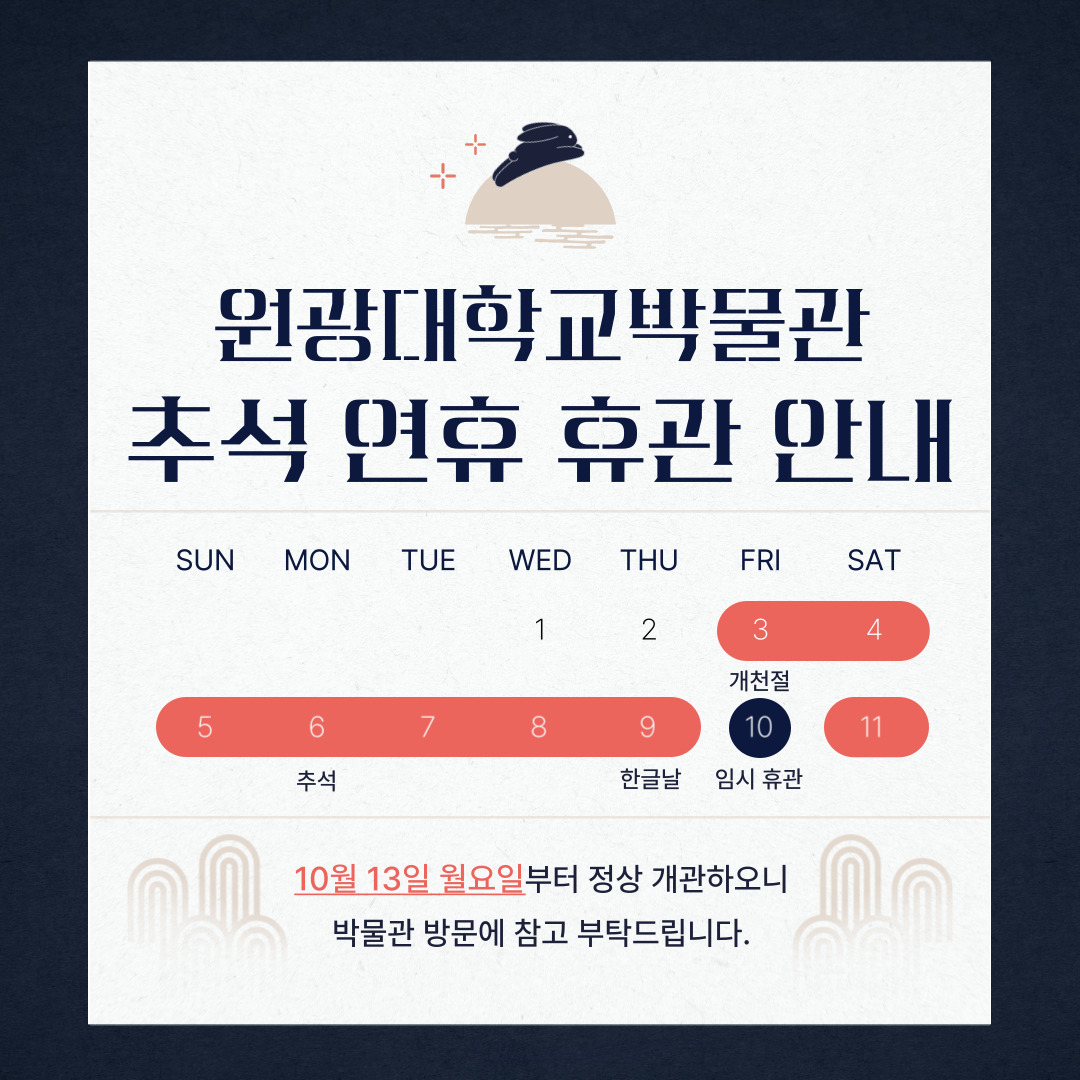 공지사항 홈공지사항 박물관 추석 연휴 휴관 공지 박물관 추석 연휴 휴관 공지 박물관2025-09-25 페이스북 트위터 구글플러스 이메일 프린트 원광대학교 박물관은 추석 연휴로 인해 10월 3일 수요일부터 10월 12일 일요일까지 휴관합니다. 10월 13일 월요일부터 정상 개관하오니 박물관 방문 시 착오 없으시길 바랍니다. 문의사항은 063-850-5482/4로 연락 주시길 바랍니다. 감사합니다. 이전공지사항