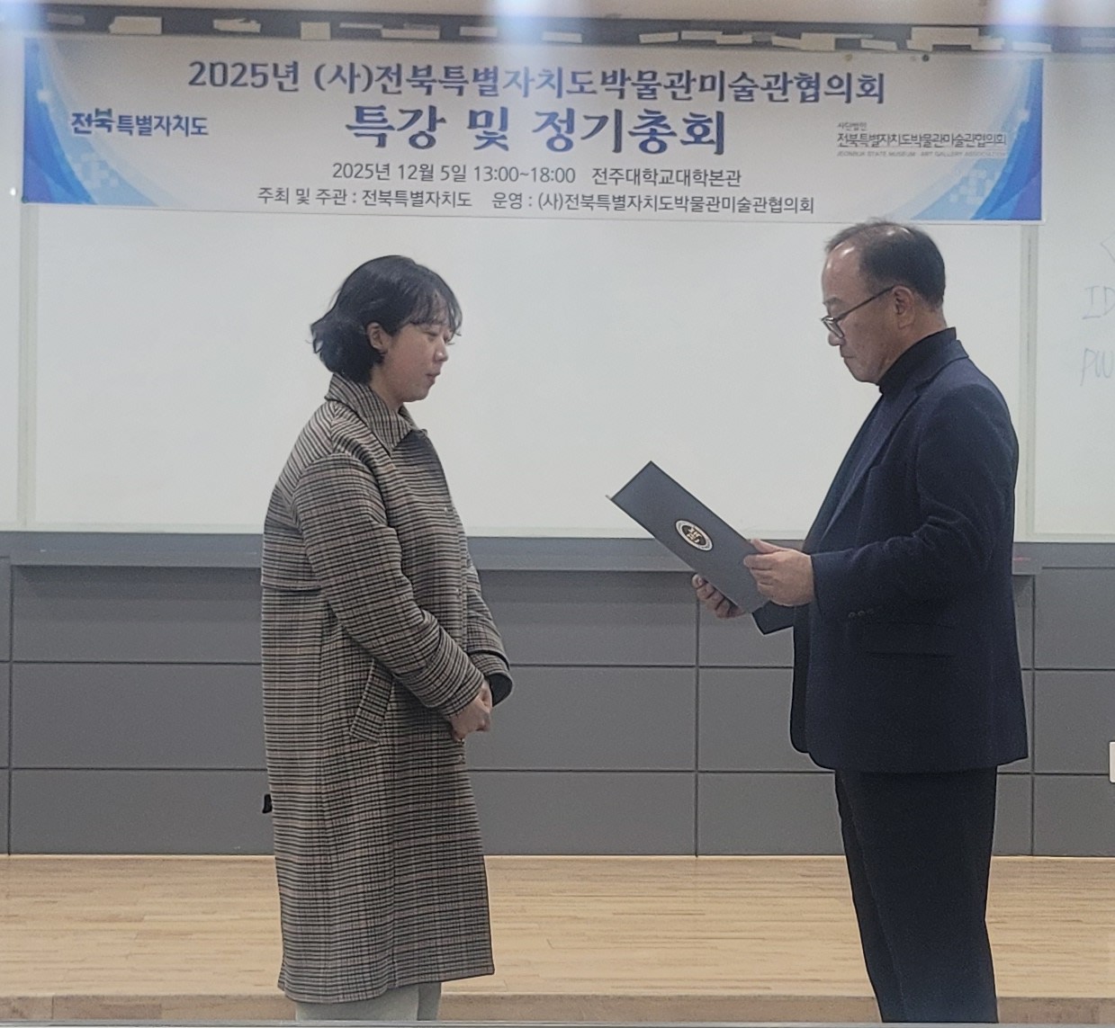 지난 12월 5일 금요일 전주대학교 대학본관 1층 세미나실에서 (사)전북특별자치도박물관미술관협의회 정기총회가 진행되었습니다. 해당 총회에서 원광대학교박물관 이미령 학예연구사님께서 ‘자랑스러운 박물관·미술관인 도지사상’을 수상하였습니다. 원광대학교박물관은 (사)전북특별자치도박물관미술관협의회에서 주관한 2025년 전북특별자치도박물관미술관 연합전시 사업에 선정되어 연합전시 ‘전북 공존의 터 – 전북 4대종교 이야기’ 를 진행한 바 있습니다.