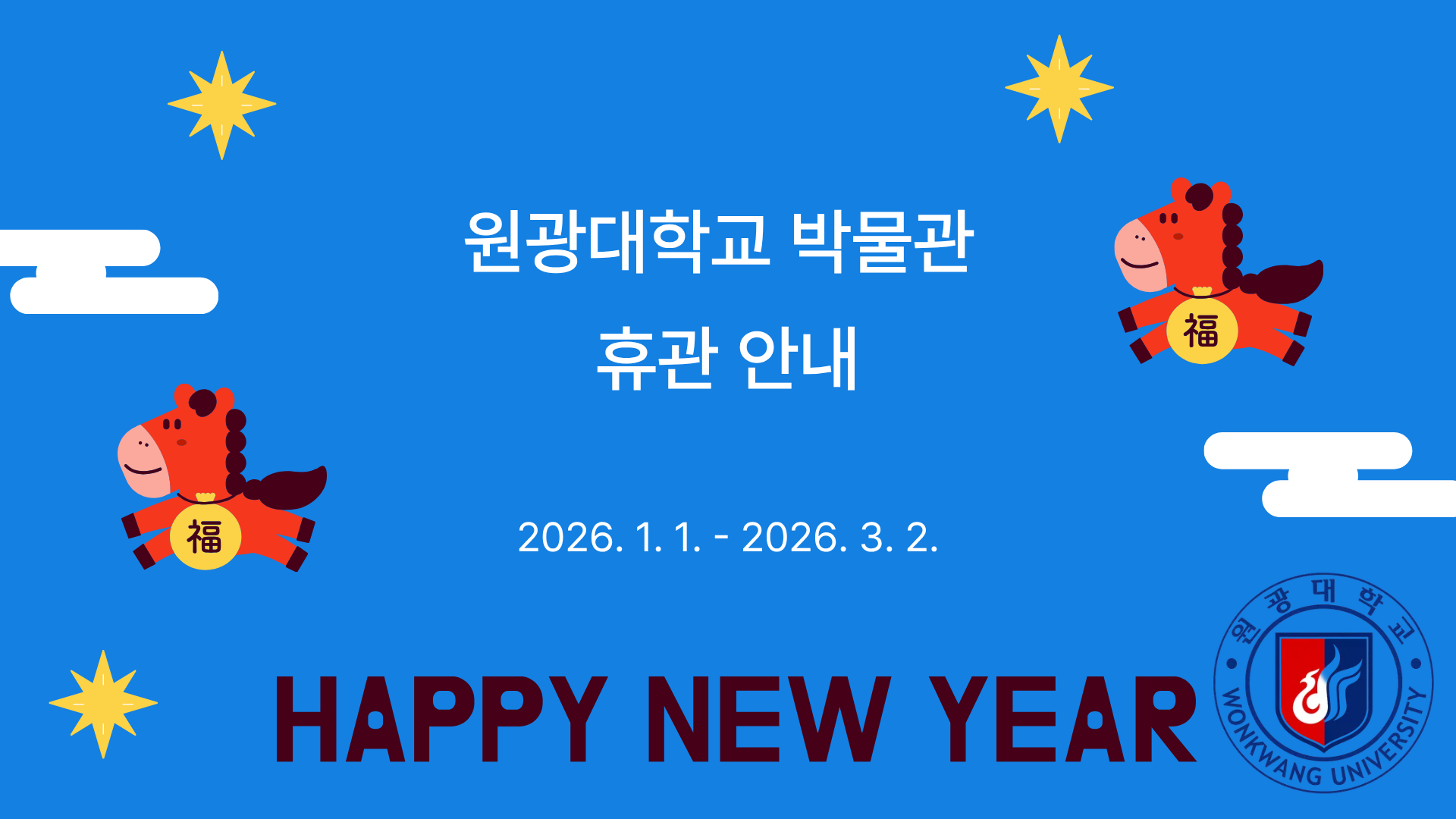 공지사항 홈공지사항 [휴관 공지] [휴관 공지] 박물관2025-12-29 페이스북 트위터 구글플러스 이메일 프린트 휴관안내 휴관일자 : 2026년 1월 1일(목) ~ 2026년 3월 2일(월)까지 박물관 내부 정비로 인해 휴관합니다. 새 해 복 많이 받으세요! 이전공지사항